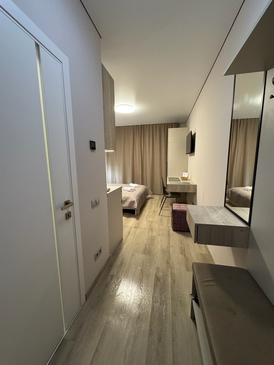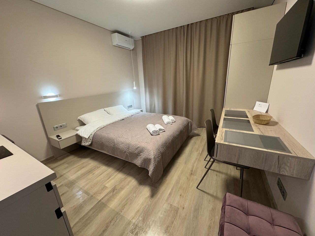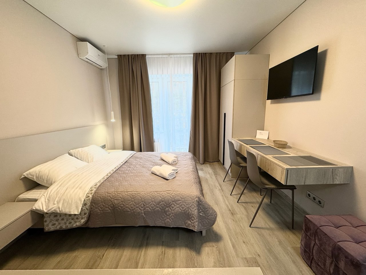 Нові однокімнатні студії з сучасним ремонтом, кухнею, індивідуальним опаленням, Smart TV та Wi-Fi. Панорамні види, тиха територія й усе для комфортного оздоровлення та відпочинку.